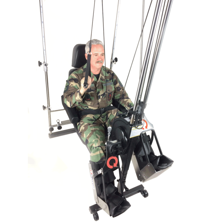 The Quadriciser performs 20 rehabilitative therapies including simulated walking, crossing midline and ankle dorsiflexion.